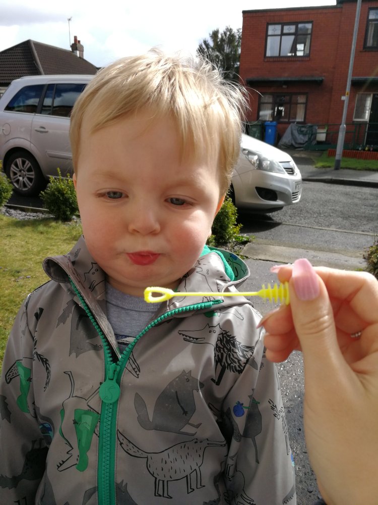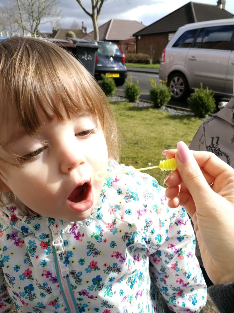 Late afternoon the rain stopped, so we put on our coats and went to the front garden to blow some bubbles. The fresh air was what we definitely needed, we were all sick of being in the house all day.