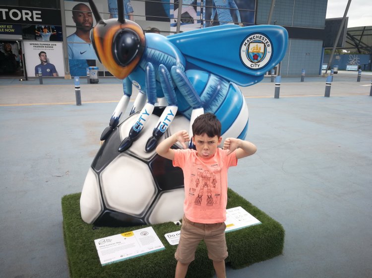 Outside the Eithad stadium we found Mike Summer-Bee. Designed by Adam Pekr-Inkversion, this Bee is based on City’s distinctive, new sky-blue home strip and it celebrates the club’s Premier League-winning 2018 season. As you can see from the photo below, Joshua wasn’t that impressed as he’s a united fan! Haha.