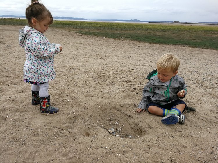 Back at the caravan we decided to scrap our early bedtime and strict routines that we both follow at our homes. We rounded the kids up and headed out of the caravan site and straight onto the beach. The beach right next to the caravan site is a rocky beach, not sandy but my three kids love it. They love nothing more than collecting shells and throwing rocks into the little pools. It wasn’t any different with our friends, all the kids loved it. It was extremely relaxing, even with 4 toddlers. All the kids seemed really chilled out, it was a lovely way to wind down before bedtime. The older three searched for seashells and collected them up. The younger four just seemed happy to walk and be free. Here’s a couple of gorgeous pictures from our evening, we almost walked as far as Hest Bank, which is pretty far with so many little legs in tow!