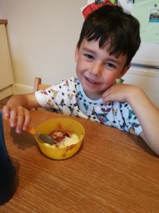 Me and Joshua got on with making the crumble by mixing sugar, flour and butter in a bowl. Its at this point Joshua decides to tell me that as he doesn’t eat blackberries he won’t try the crumble. I know he’s fussy, but as we had picked the blackberries ourselves and he helped making the crumble, he would of at least tried it!