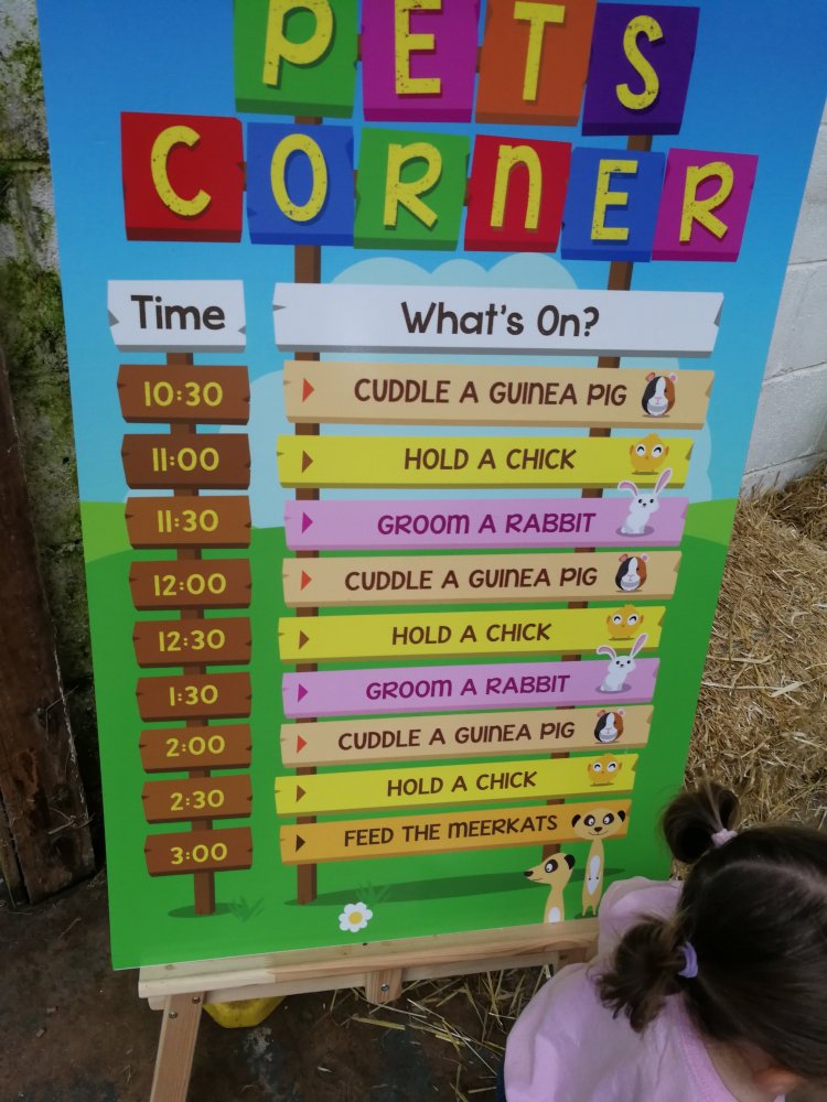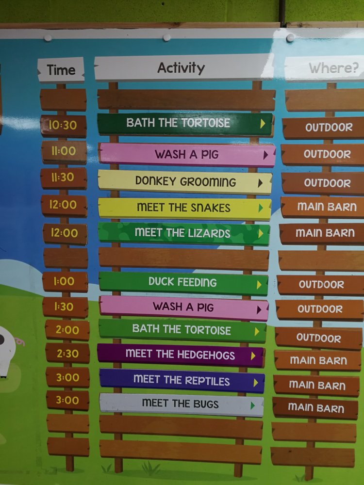 We were soon heading into the Pets Corner and again they had the activities on that day listed. The kids said they wanted to do everything!