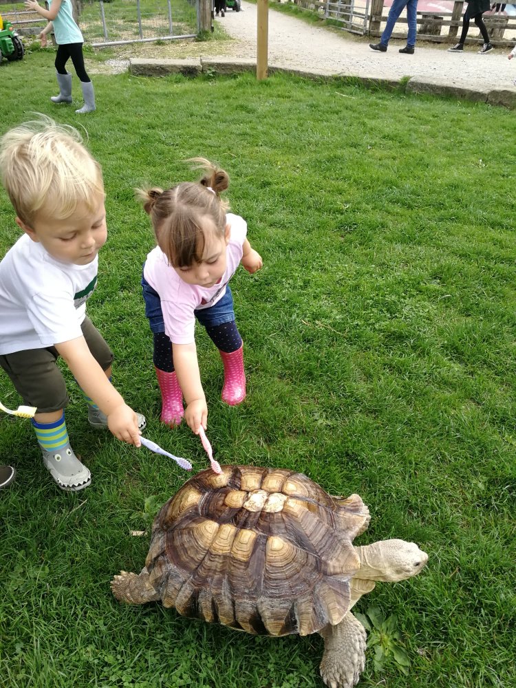 One of the first things they wanted to do was wash a tortoise. Joshua my eldest soon got bored as he did this last and he ran off looking for a tractor. But Oscar and Isla, my 2 year old twins absolutely loved washing Percy with toothbrushes!