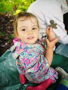 Next was snack time, a favourite part of any activity for my greedy pair! Haha! Carrying on with the theme, each child (and parent) was given a little gingerbread man each from Ellie. There was also water and juice for the kids and tea or coffee for us parents. There was something very relaxing about enjoying a hot coffee on a wet Tuesday morning in the woods, it was lovely!