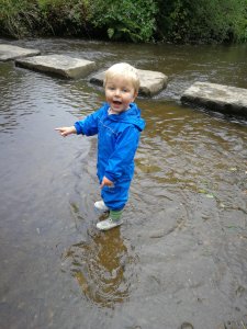 We found some giant leaves and drew little faces on the bread stick. We then headed down to the riverside across the stepping stones. Testing my twin mum skills again and with the help from Ellie, we were soon stood on the river bank where the children all let their ‘gingerbread man’ set sail on their ‘boats’. The children loved it, shouting ‘bye’ and waving as they floated away. They couldn’t resist a little jump in the river either!