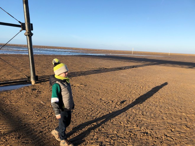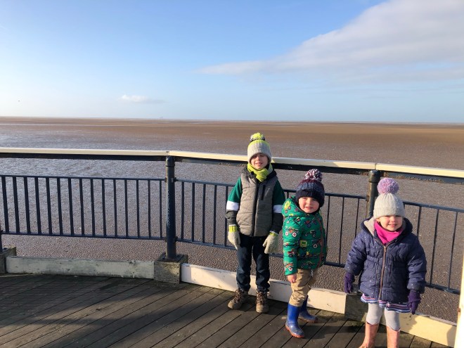 We got back on the pier and this time headed onto the beach. My three thought it was brilliant that they were wearing wellies or walking boots and headed straight for the water. The sea was miles out, but there was still plenty of water for paddling. We spent ages walking through the water, searching for giant shells and throwing stones. Throwing stones into water is a favourite past-time of one of my twins especially, Oscar could literally do this all day.