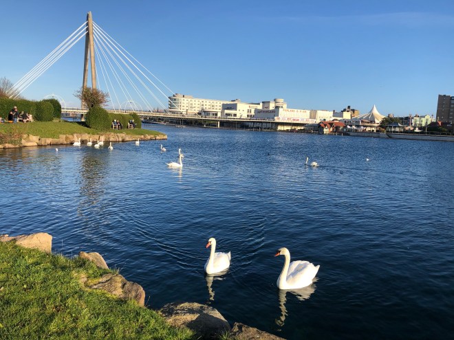 There’s a great wooden playground close to the arcades and the lake. We crossed over the lake and walked along the lakeside which was very idyllic. It was a lovely sunny (but cold) day, there was plenty of people around and the lake was full of swans.