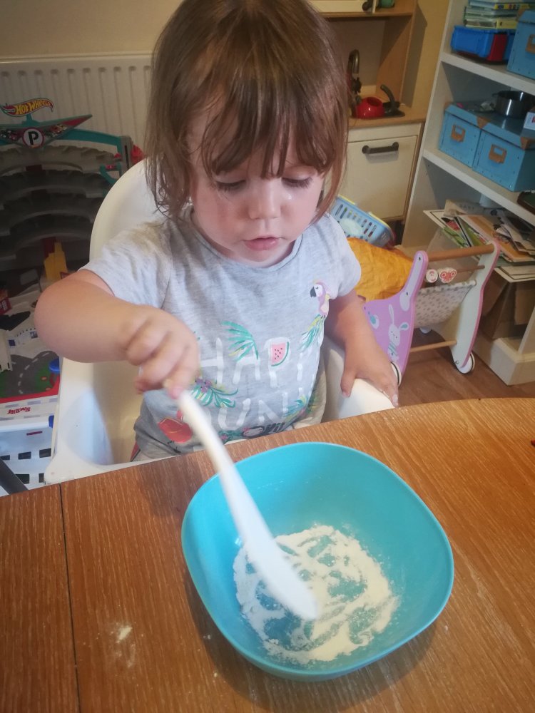 Once Joshua came home from school, I started to get everything ready to cook. I measured out the ingredients, I even had a little helping hand!