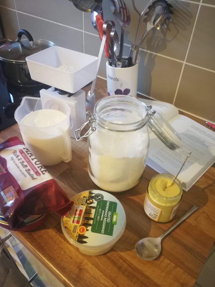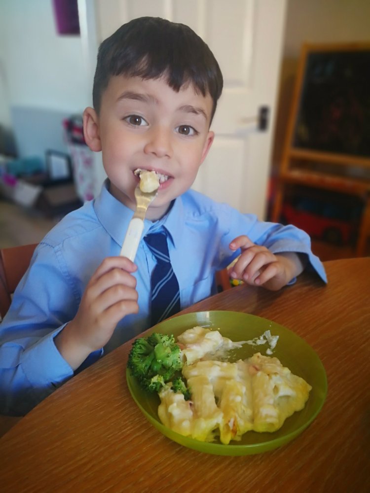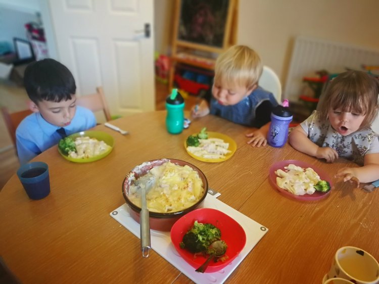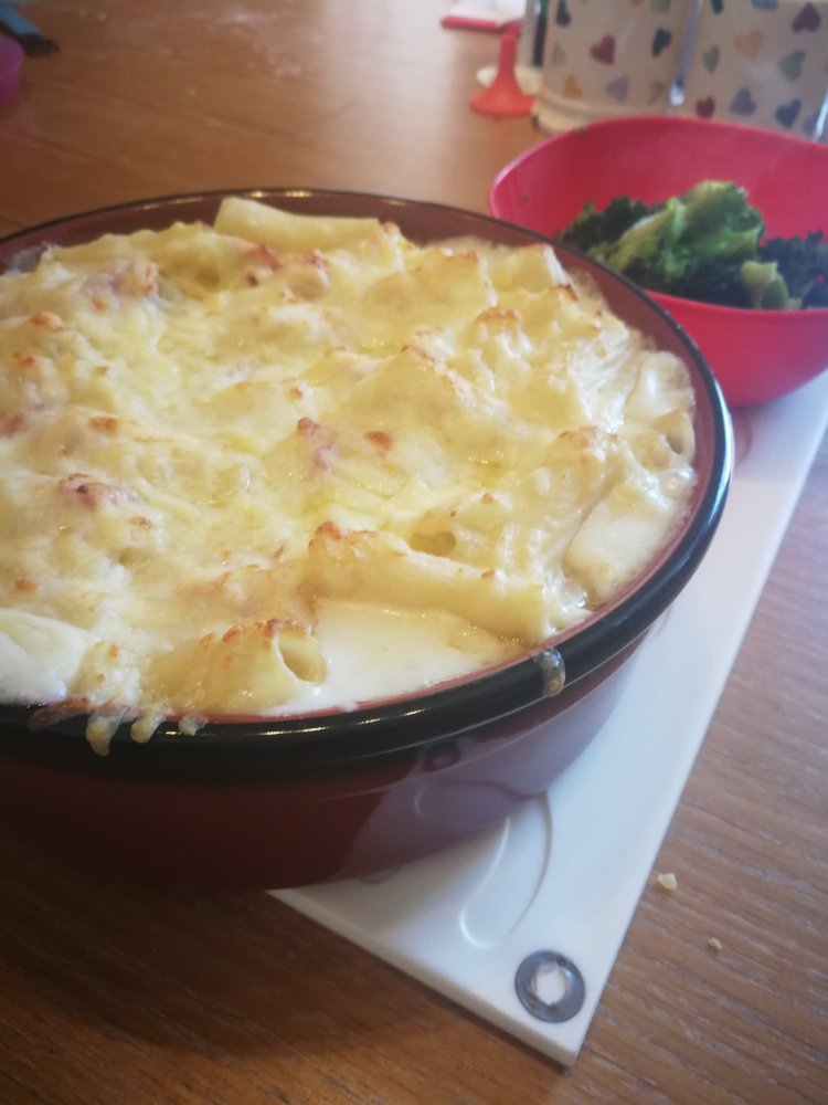 Once the sauce was smooth and thickened, we mixed it all in together and placed it in an oven proof dish, before putting some grated cheese on top and placed it in the oven for 20 minutes. Just enough time to round up the kids, get them cleaned up and sat at the table.