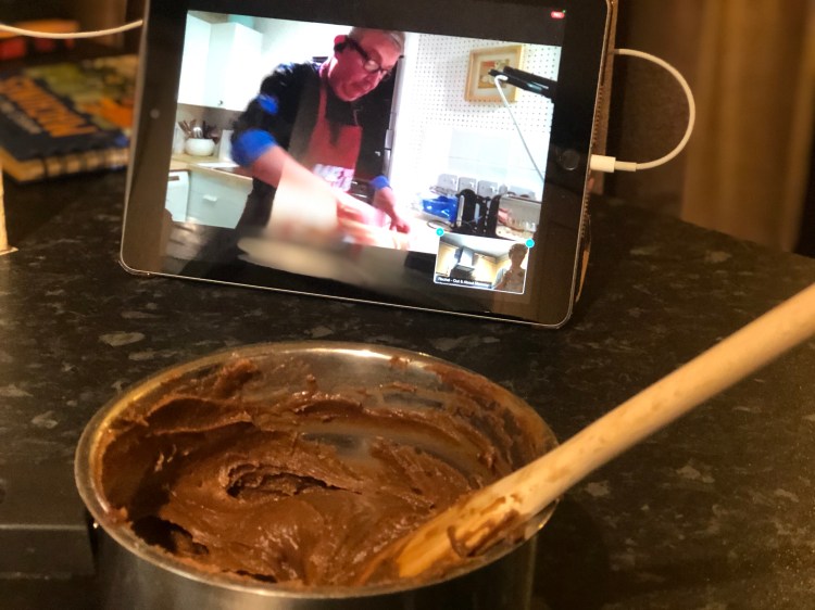 About an hour before the zoom call, I prepared my work space, set up the laptop and weighed out a few things. I got out the pans and baking trays I was going to use, measured out the flour and chopped up some dark chocolate. I was using raspberries instead of black cherries as I’d been to a few supermarkets and couldn’t find cherries. I popped on my apron and we were ready to start.