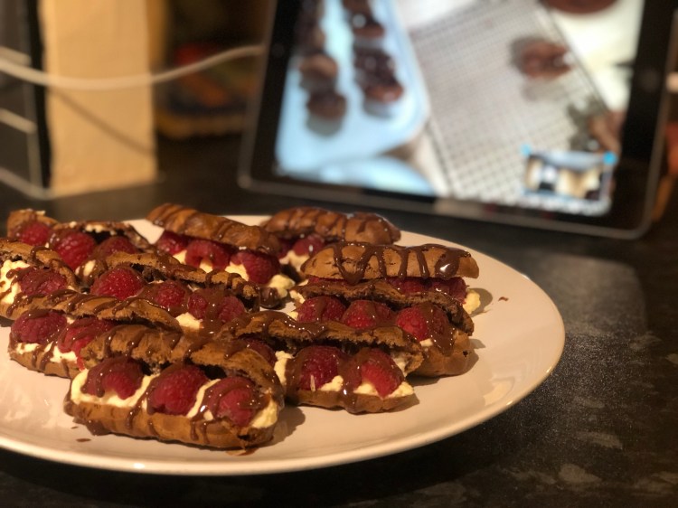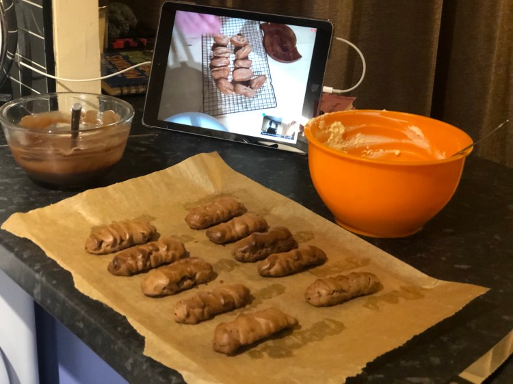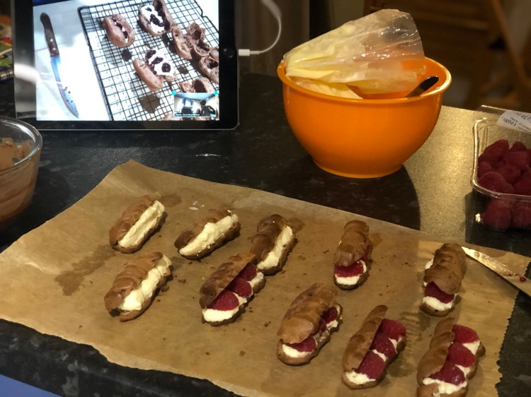 I joined the zoom call and was greeted by host and Bake With A Legend founder, Josh Landy, 4 other bakers like me and of course Howard Middleton. We all said hello and Josh and Howard gave us a bit of information about Bake With A Legend and making eclairs. Howard had a camera set on him and one set on his workspace which was fab, as we got started it was easy to follow what he was doing. I explained I had to substitute black cherries for raspberries, another baker had cherry jam. Howard said both were perfect substitutes. This recipe for eclairs certainly is a great for a lockdown bake as you can just use what you have.