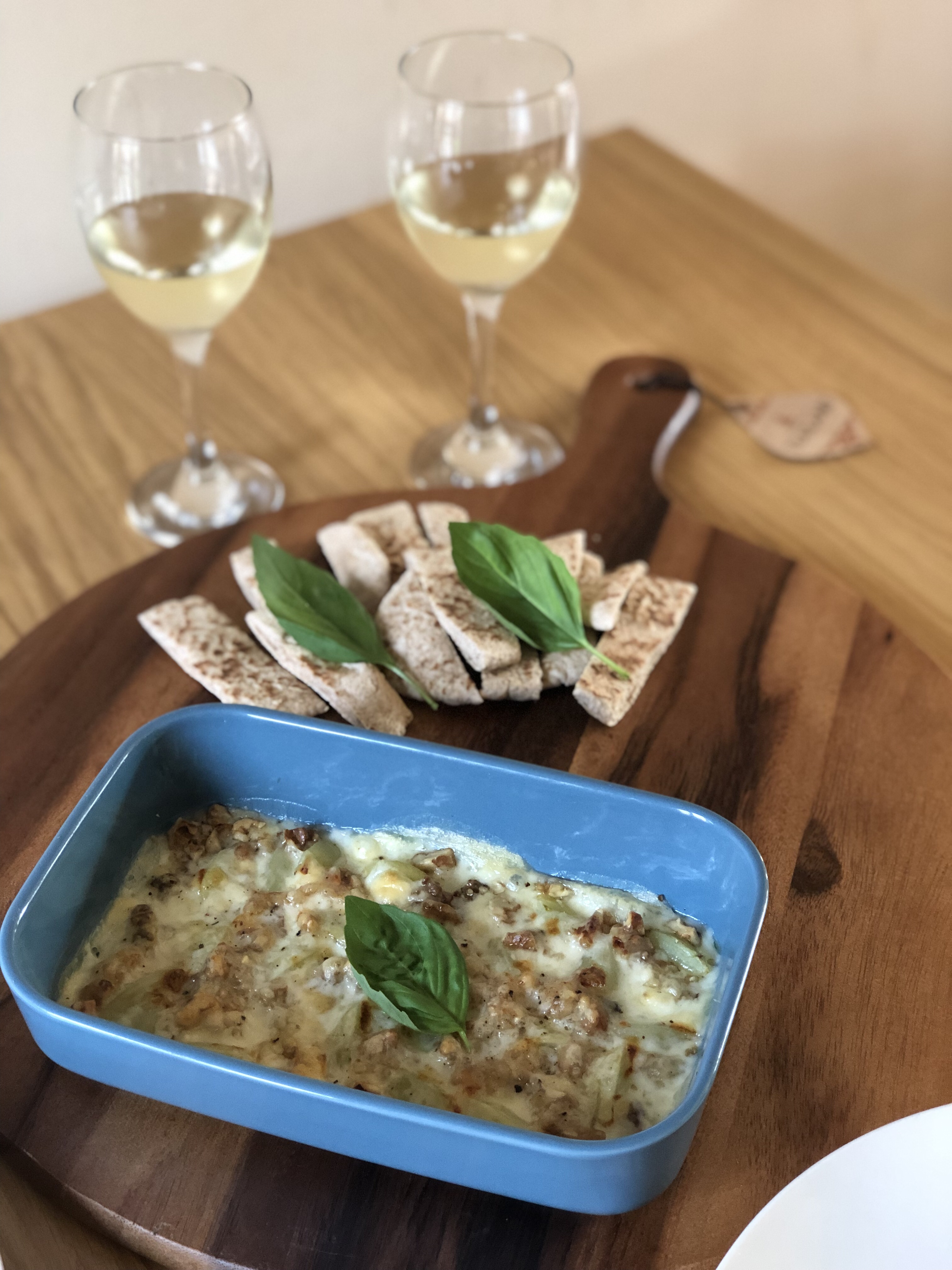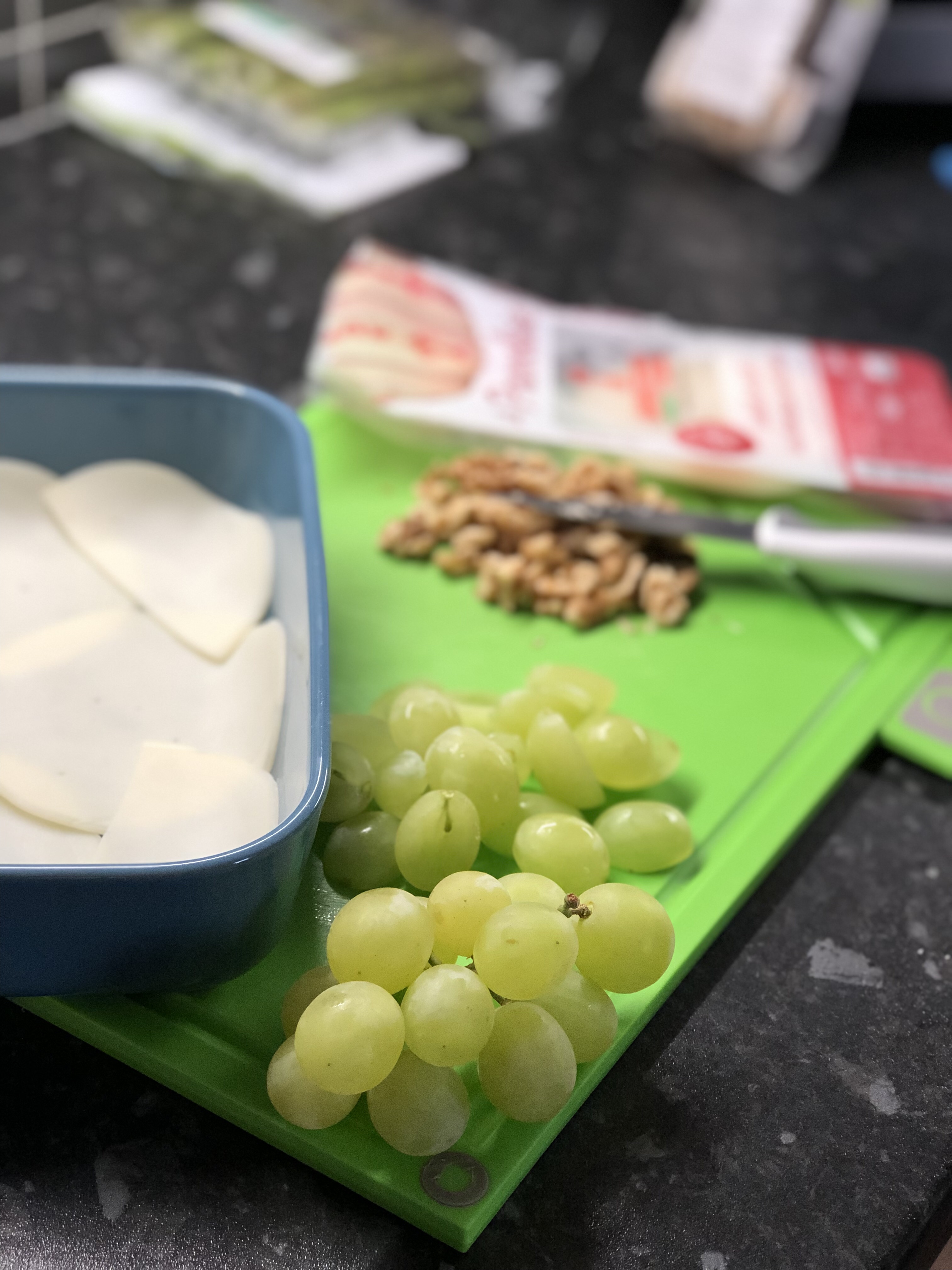 Once the kids were in bed I started on our meal. I chose quite simple dishes as I didn’t want to spend most of the evening in the kitchen. I decided to make a Provolone Cheese, Walnut and Grape Dip for starter and Chicken with Provolone Cheese and Parma Ham.
