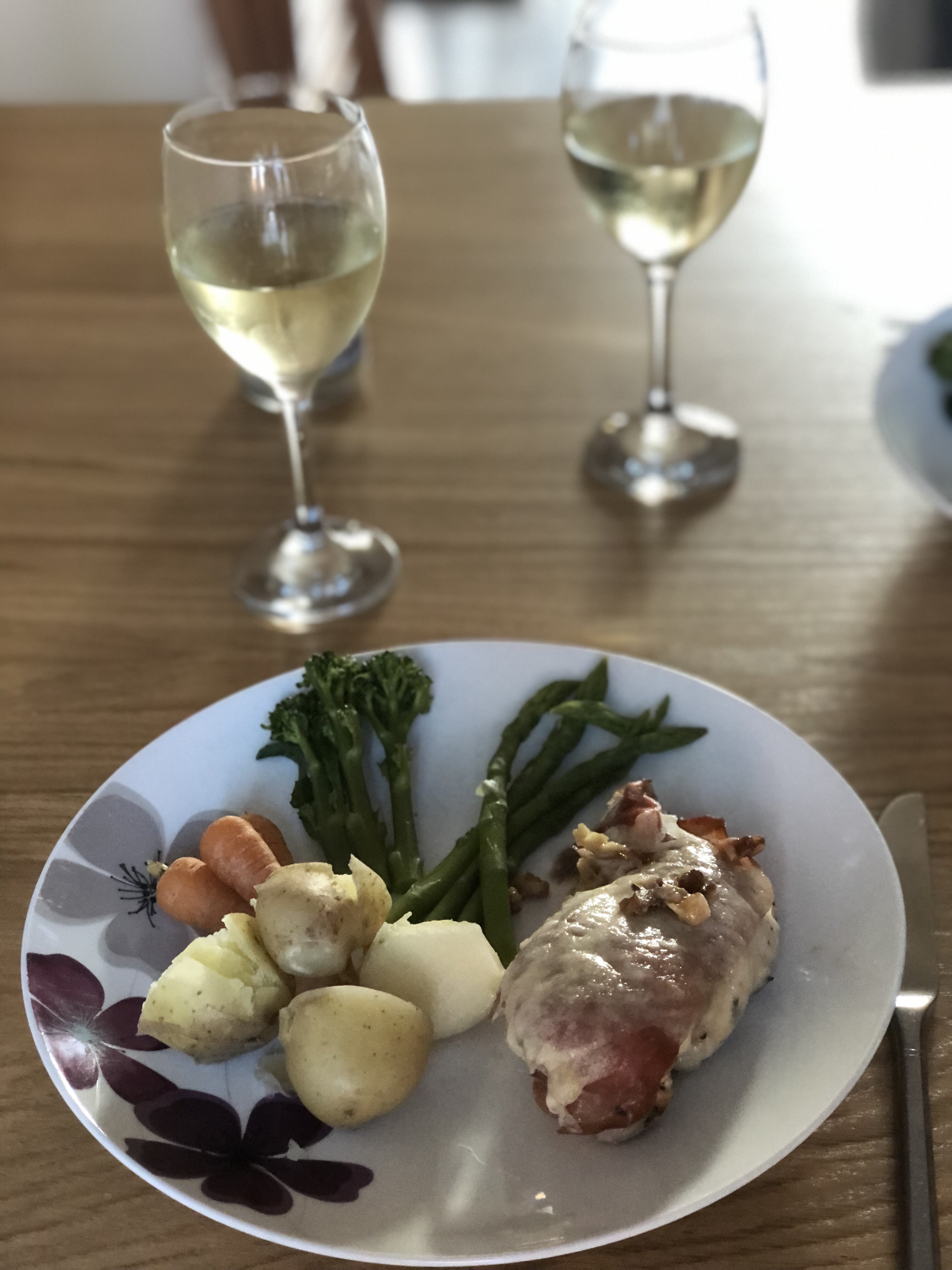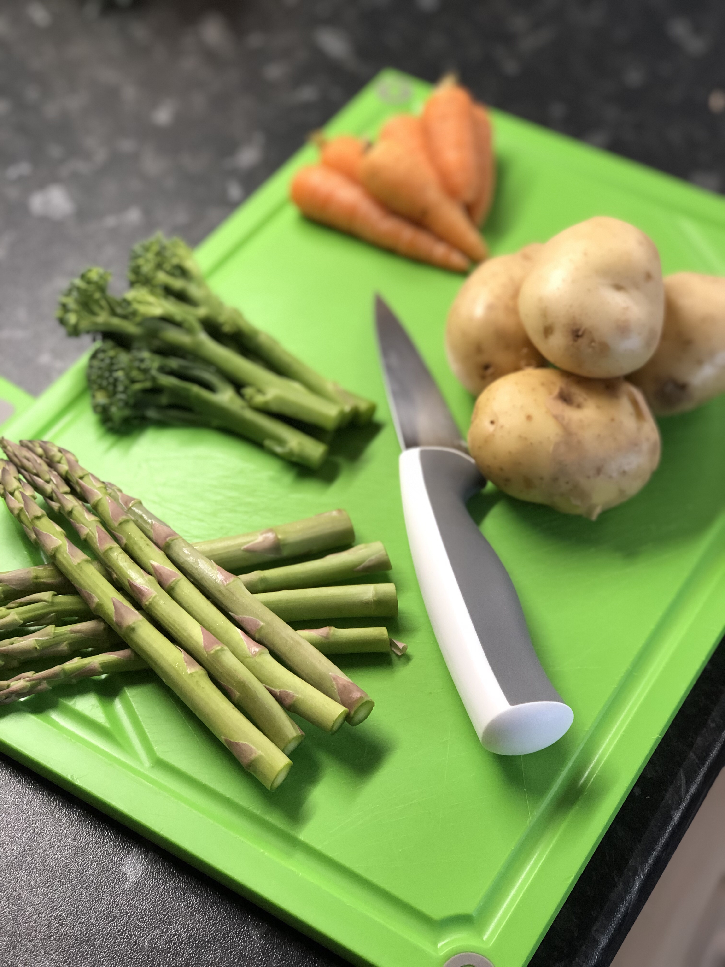 Whilst the chicken was cooking, I chopped up some of our favourite vegetables including asparagus and tenderstem broccoli plus some Jersey Royal potatoes.
