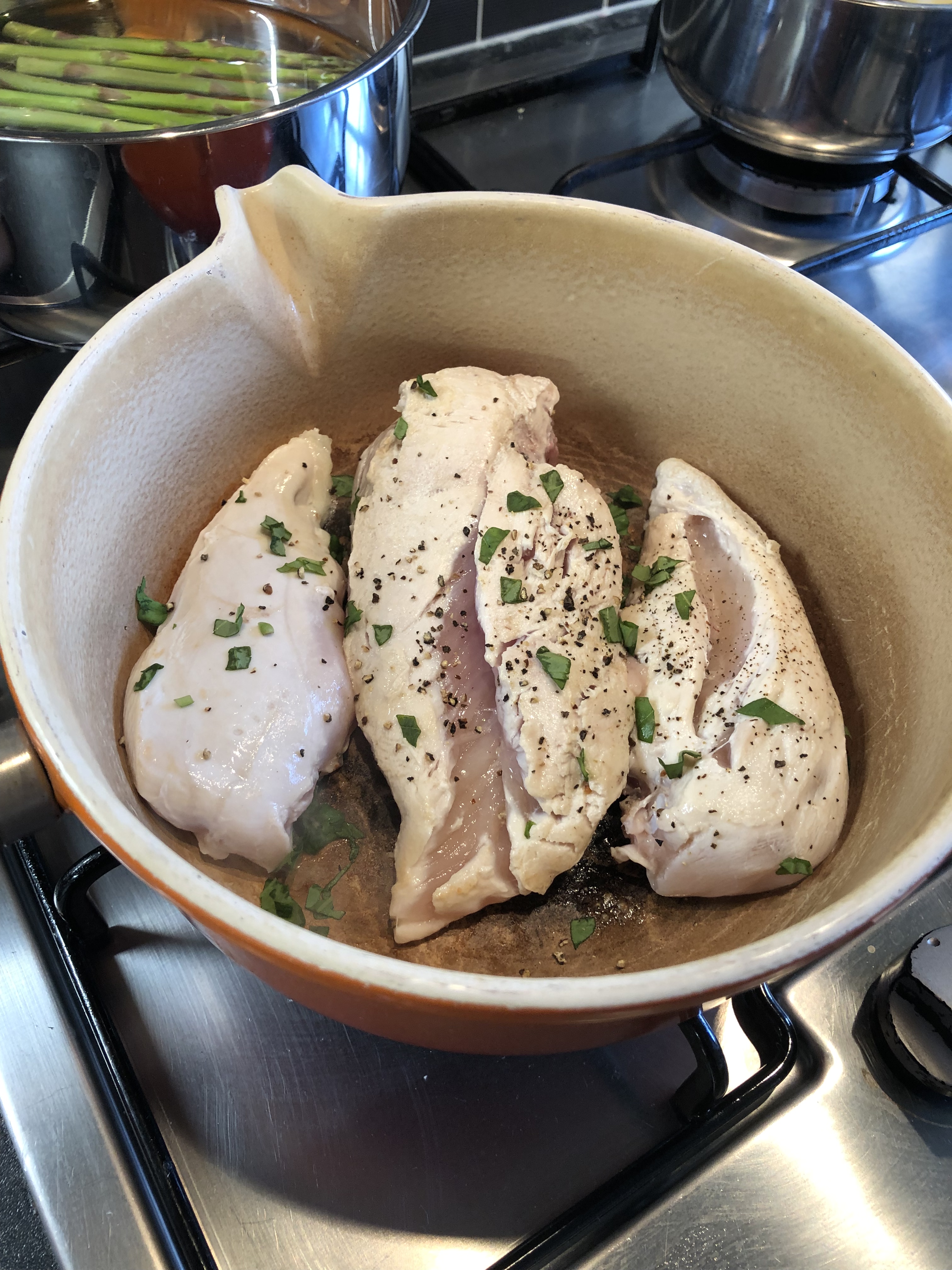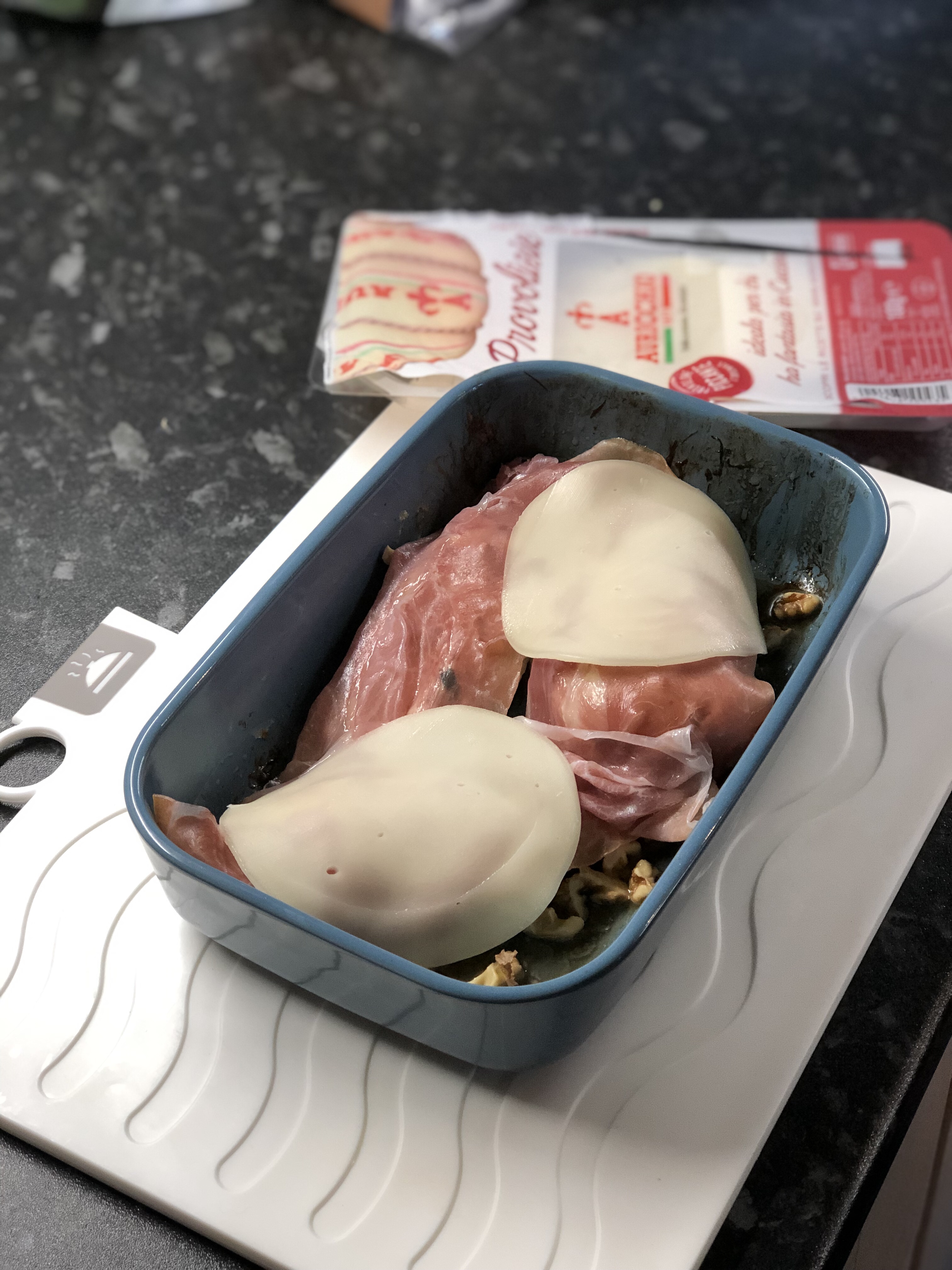 After 15 minutes, I layered the chicken with Parma ham and the provolone cheese and put back in the oven until the chicken was cooked.