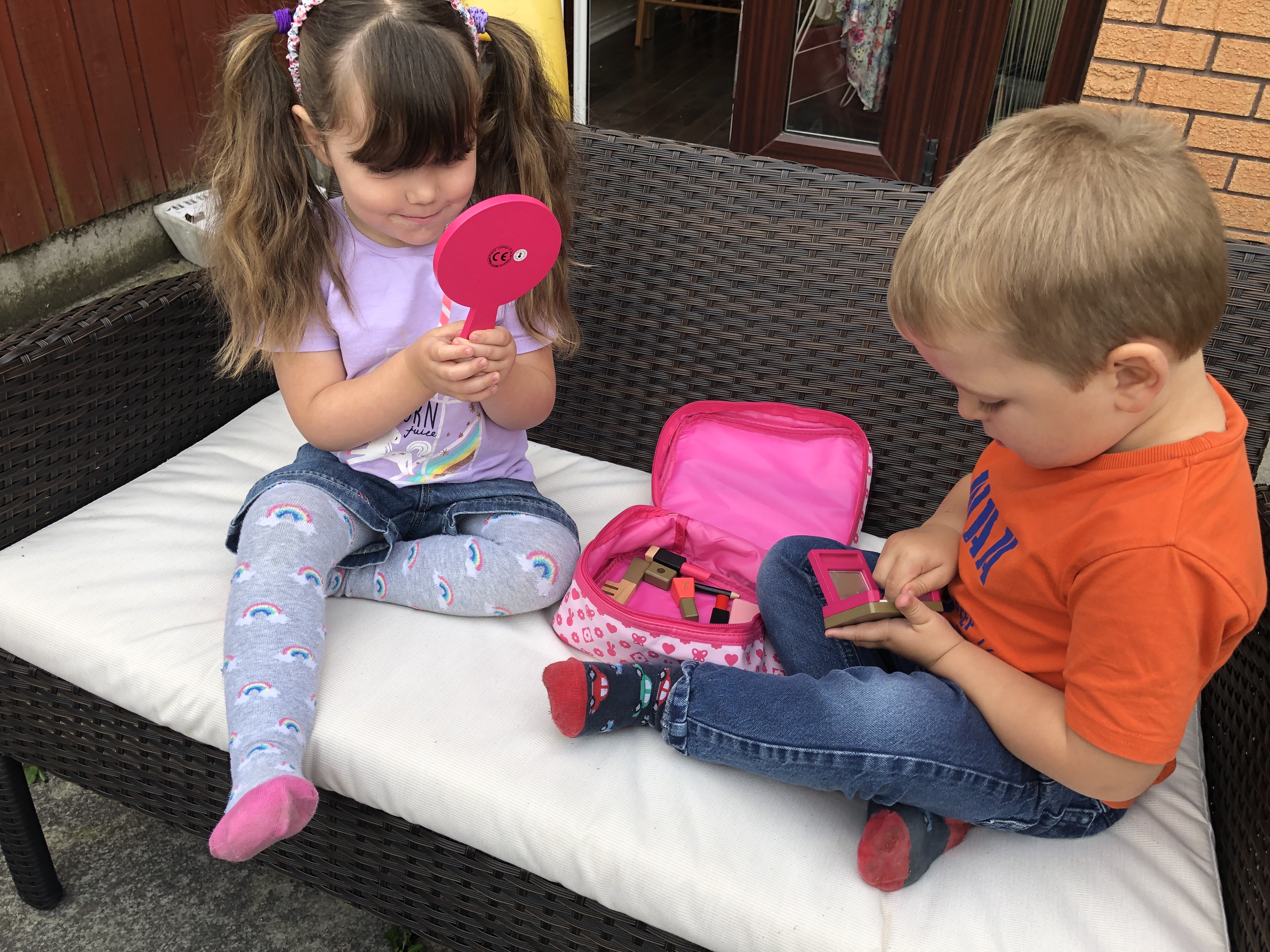 Isla thought it was brilliant, she was extremely happy with the toy as was I. Not only are the items inside extremely cute, but they don’t feel cheap. The items were all wooden and feel like they will last the hands of my toddlers. Included was a brush and mirror, two nail polishes, two lip sticks, an eye liner, an eyeshadow pallet and some perfume. My three year olds have loved playing with this.