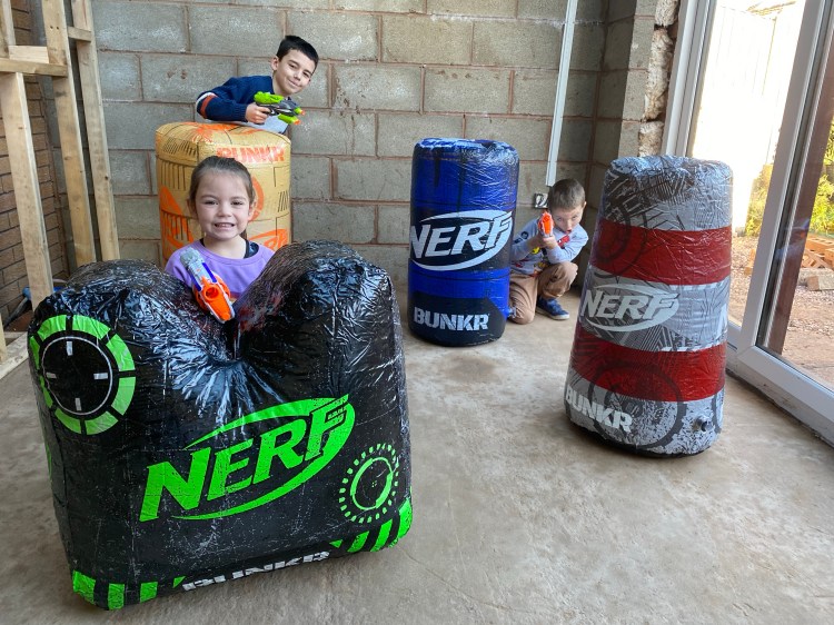 We were sent the NERF BUNKR Go Battle Set that retails at around £20 in Argos, Amazon and other retailers. The kids loved them! I used a electric air pump to quickly inflate them. The battle set is for indoor and outdoor use, we will certainty use them outdoors in summer. Our house is like a building site at the moment and the new half-built extension room was a perfect battle field! The inflatables are great to hid behind, plus some have little areas on the top which is great to hold the bullets. This set definitely takes playing with NERF guns to the next level and kept my kids happy for ages!