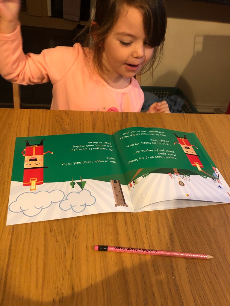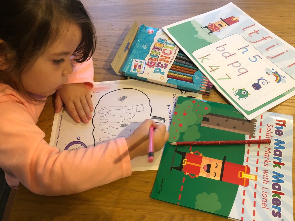 We were sent a story book, The Mark Makers Solider Marks with Lionel and some colouring and activity sheets. We started by looking at the book together and I read it to my two 4 year olds. They really enjoyed the colourful characters and thought it was lots of fun when they got to have a go at tracing the lines with their fingers or looking for the letters and shapes themselves.