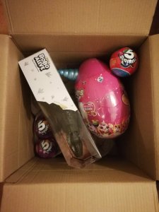 They excitedly showed each other what treasure they uncovered, stopping to look at the toys before getting the next segment open.