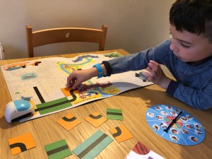 We picked up how the play the game really quickly and Joshua seemed to have lots of fun. Me and Joshua took turn to pick up the magnetic road tiles. Joshua sounds the wheel to decided which challenge we would play. The aim of the game is to work out a route for the magic self-driving car to its destinations.