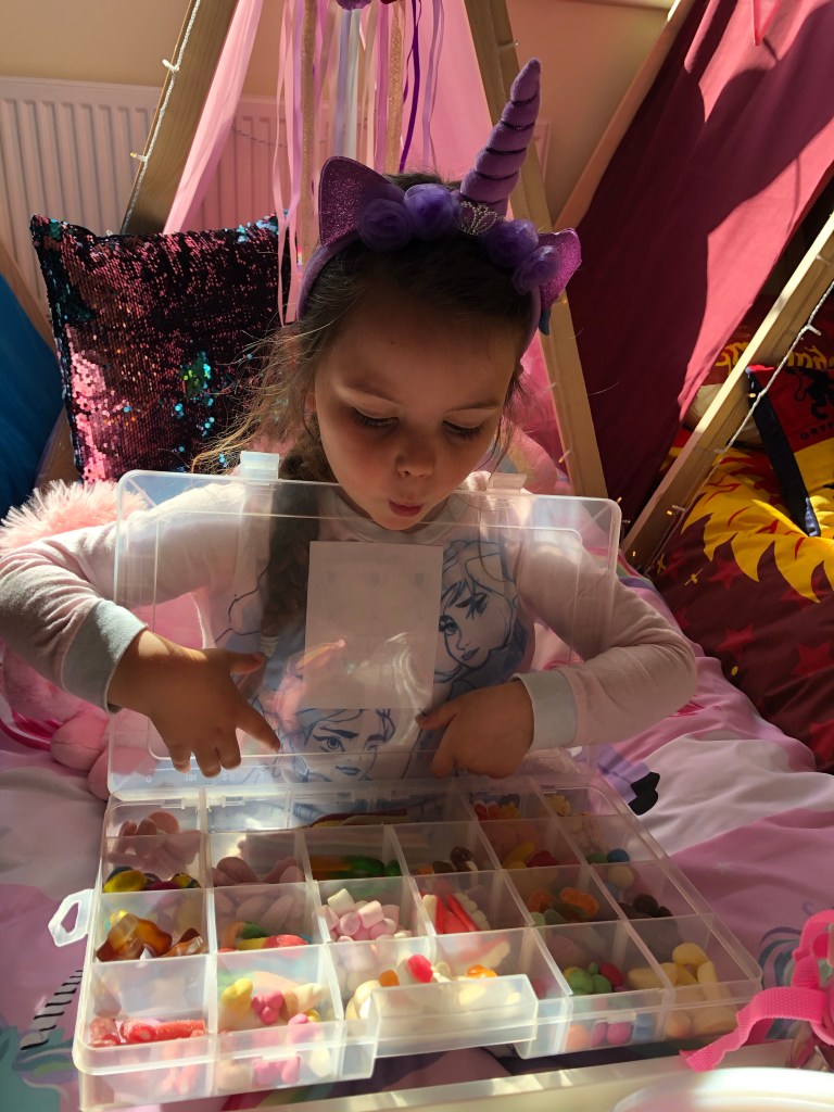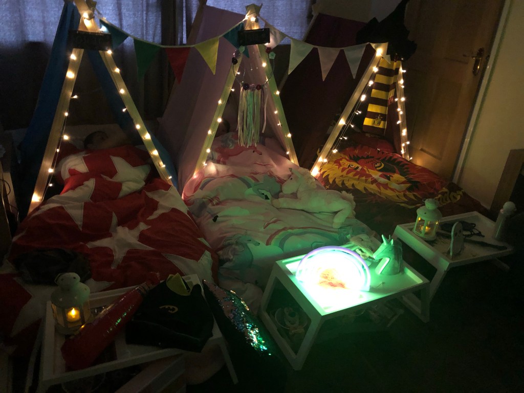 The air beds used by Superstar Sleepovers are full sized single air beds which was great. Each child got a proper duvet cover and pillow. The personalised touches were also lovely. On the top of each teepee was a child’s name and a giant box of sweets came too which was also personalised!
