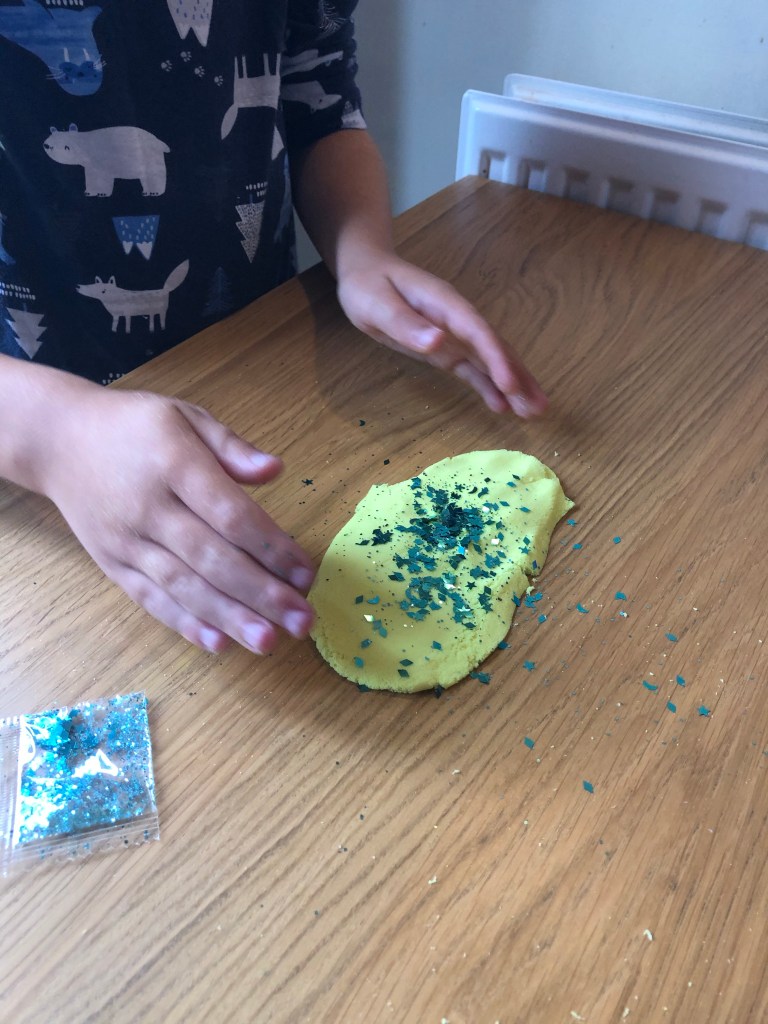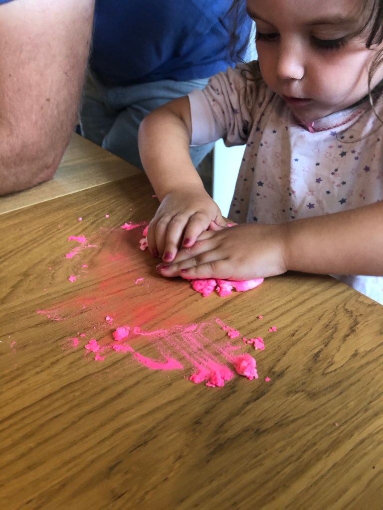 Next the kids stretched out their sand onto a clean surface (instructions say protect your surface but i found it fine on our kitchen table) and folded in the coloured powder and sparkles.